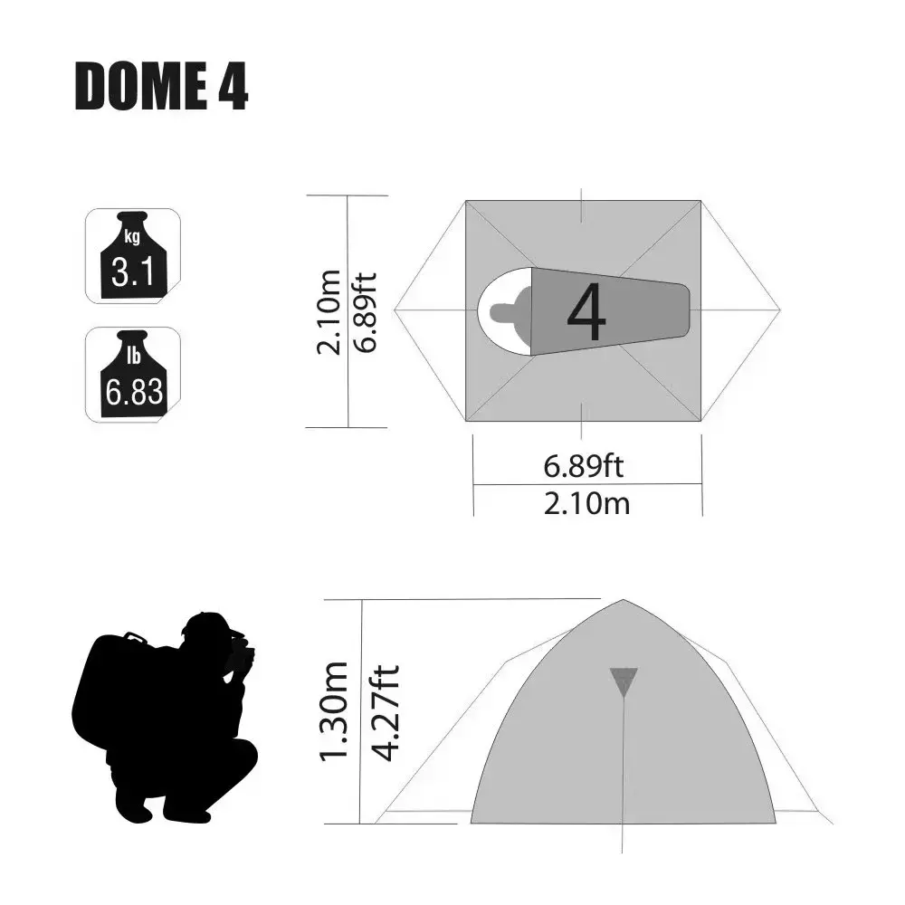 Seu diferencial está na facilidade de montar e manusear: sua estrutura é feita em varetas de fibra de vidro interligadas por elástico interno. A Dome é do tipo Iglu, com sobreteto completo.