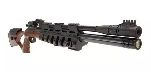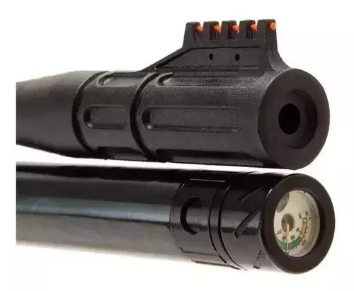 Modelo muito preciso, também conta com alça e massa de mira com fibra óptica, com ajuste de altura e lateral na parte da alça de mira. A parte do cilindro conta com um manômetro de fácil leitura, para que você consiga saber quando é a hora de recarregar seu equipamento.