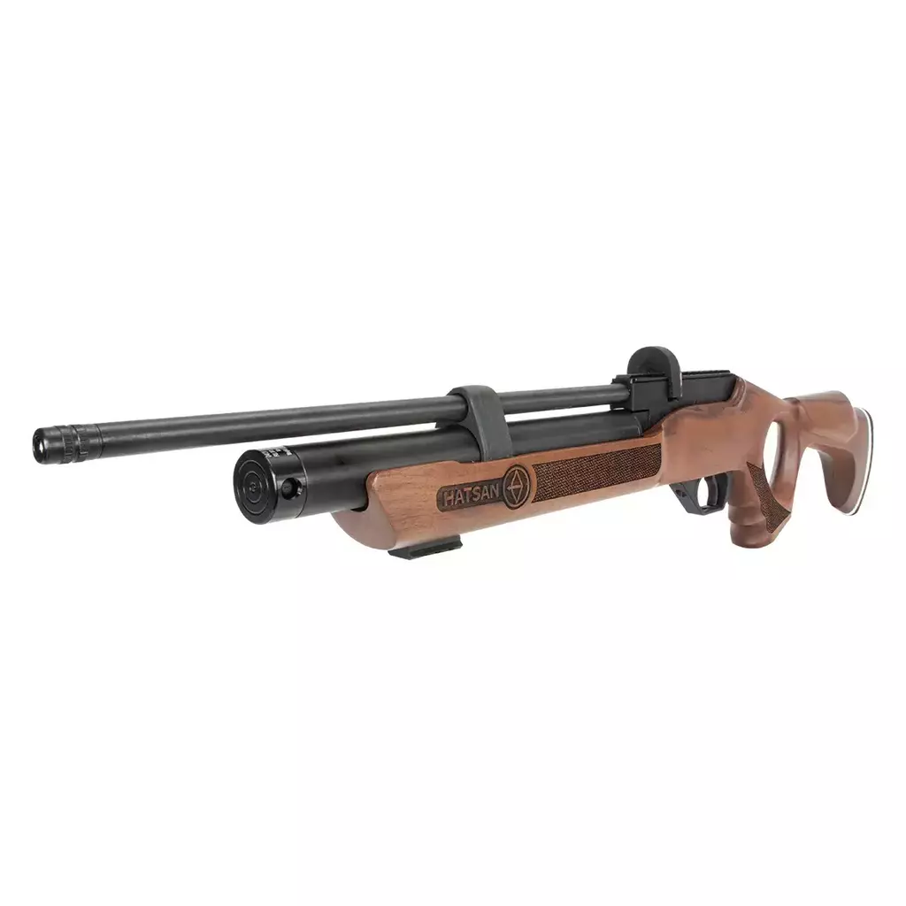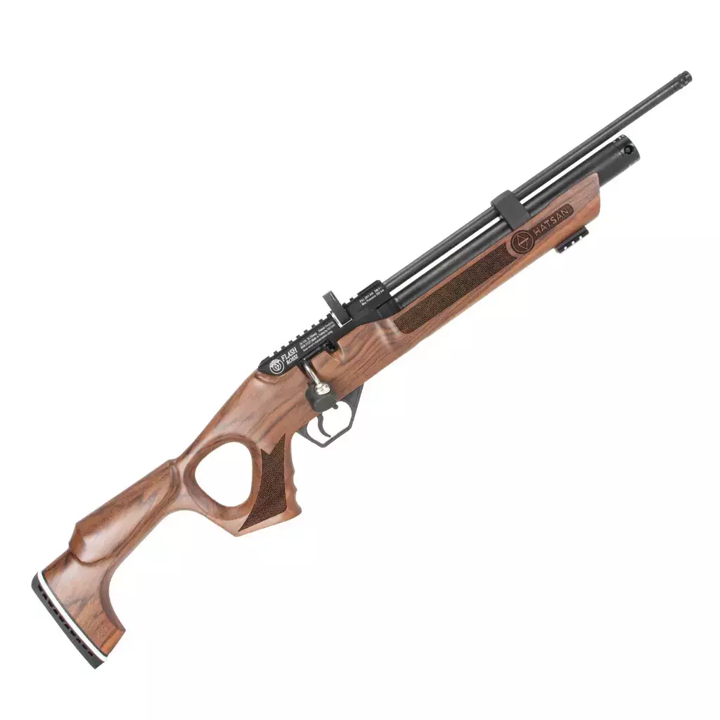 A Carabina de Pressão Hatsan Flash Wood é uma PCP (sistema pneumático pré carregado), inovadora, de excelente precisão, conforto e potência. Uma das primeiras e poucas versões a chegar ao Brasil com disponibilidade de Calibre .25' ou 6,35mm como chamamos aqui. O Calibre passa a ser completamente legal à partir da delimitação de calibres de acordo com a tabela de produtos controlados pelo Exército. Sua coronha ambidestra de madeira de lei é estilo tática (design tático) com abertura para encaixe do polegar e magazine capacidade 10 tiros, possui também adaptador para disparos sem o magazine. Com mecanismo de alimentação que previne o carregamento de mais de um chumbinho no cano, permite engatilhamento manual através de alavanca lateral. Possui cilindro de ar com volume de 165 cc e capacidade de 200 BAR de pressão e manômetro integrado no cilindro de ar para controle de pressão. Seu Gatilho é em Polímero e oferece 2 possibilidades de ajuste personalizados. A Autonomia de Tiros gira em torno de 90, sendo considerados 40 bons (com cilindro carga máxima). Acompanha adaptador para disparos sem utilização do magazine (Sistema Mono tiro / Single Shot). A Coronha é ambidestra em madeira de lei, com sistema Thumb Hole (encaixe para o polegar)