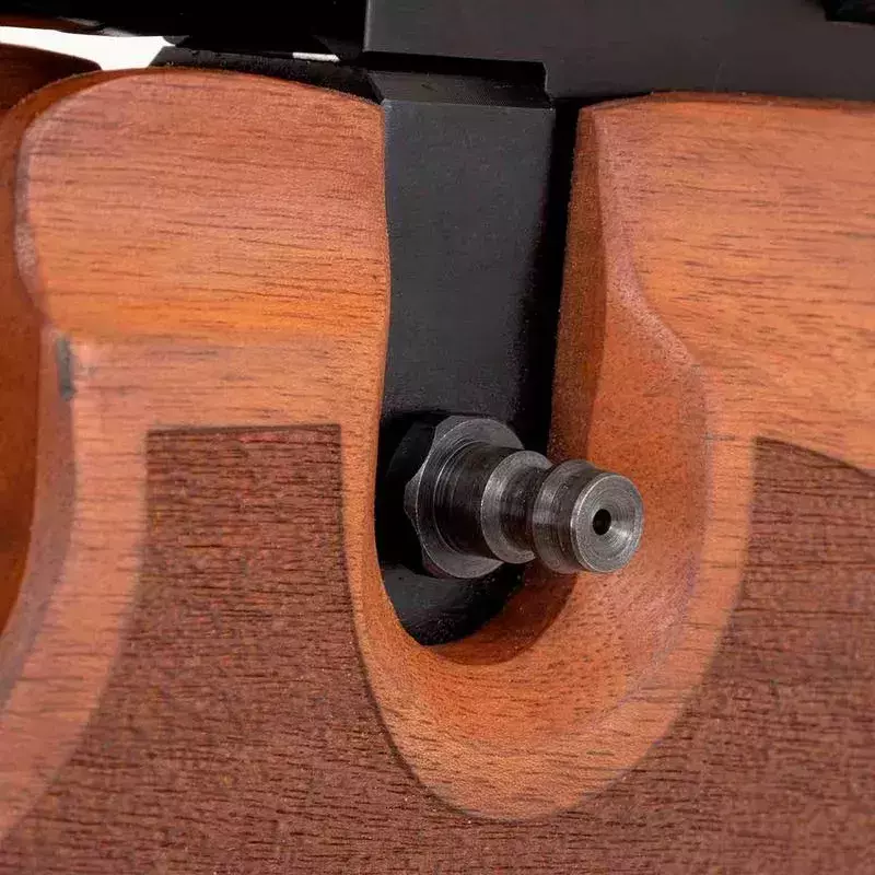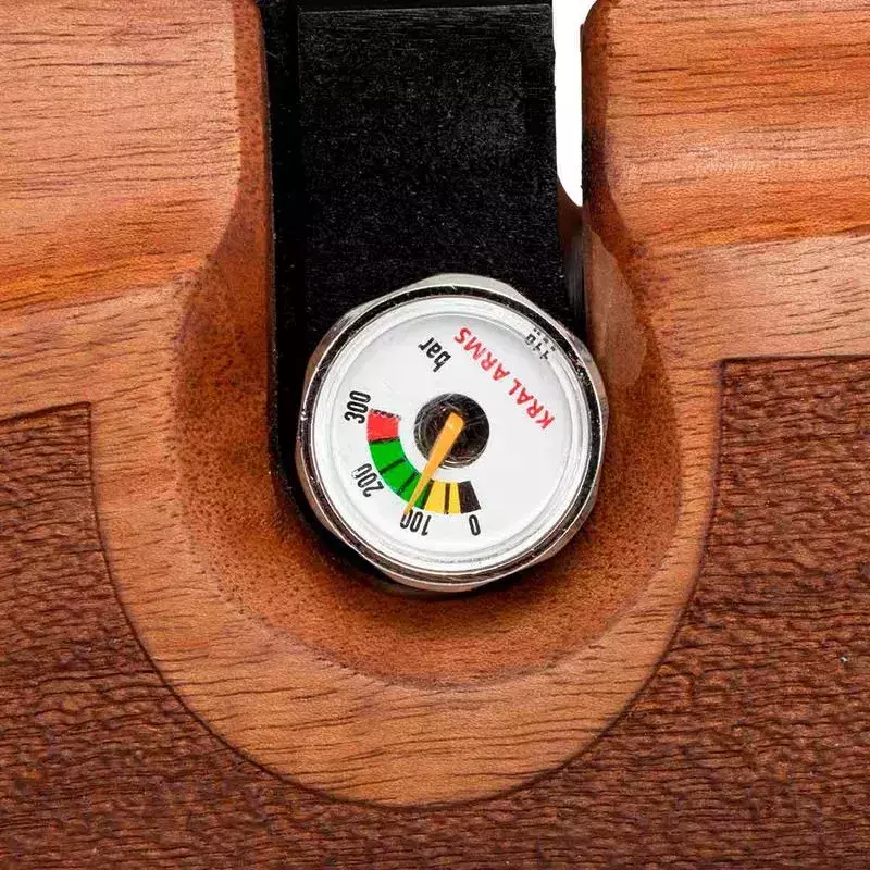 Seu corpo e seu cilindro de ar possuem acabamento anodizado e essa carabina conta com manômetro embutido, facilitando a leitura de pressão do cilindro.