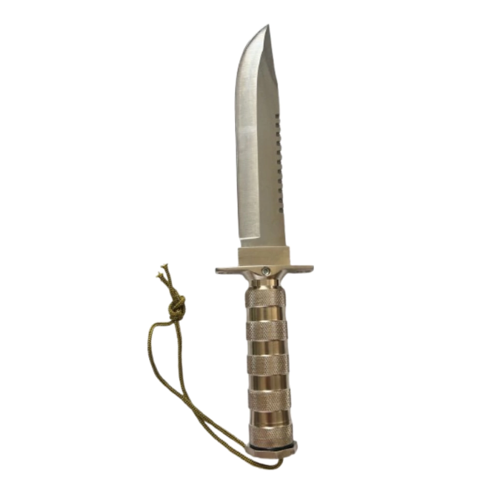 A Faca Tática Prata com Cabo Antiderrapante combina durabilidade, aderência e funcionalidade em um único design. Com acabamento prateado, essa faca é ideal para atividades ao ar livre, sobrevivência e uso tático. Seu cabo circular conta com 5 tiras antiderrapantes e 4 tiras lisas, proporcionando firmeza e conforto no manuseio. A lâmina versátil possui dentes serrilhados de um lado e uma serra no outro, tornando-a uma ferramenta essencial para cortes diversos.