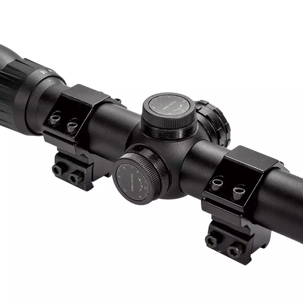 Possui ajuste de elevação e lateralidade por torres, ajuste de dioptria e coroa para regular o zoom de 4x até 16x.